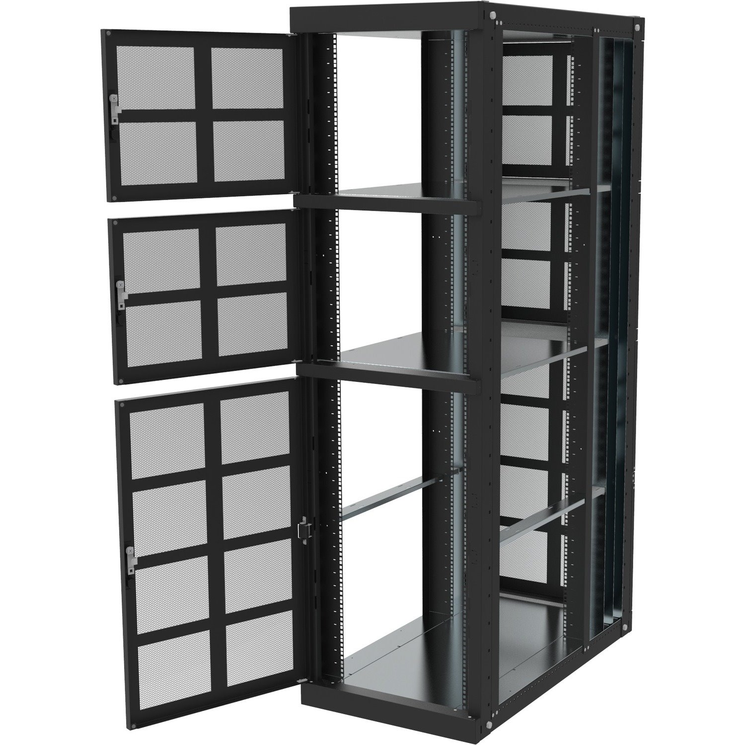 Our colocation cabinet provides a secure, self-contained means for 2, 3, and 4 tenants to share a single cabinet. This colocation rack efficiently utilizes the floor space in the data center by minimizing the amount of unused space in the secure IT cabinet. The quality of manufacturing in this sever colocation will instill confidence in the tenant that their physical infrastructure is protected from unauthorized access. RackSolutions designer and manufacturer if the industry's most innovative IT infrastructure products, has developed a unique colocation cabinet rack containing features that are matched in the industry, The most distinctive feature of this IT cabinet rack is the secure cable channels (located in the back) within each compartment. The secure channels are compatible with overhead and underfloor structured cabling products.